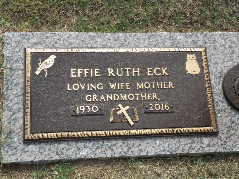 - [S8049] Find A Grave: Memorial Park Cemetery, Enid, Oklahoma, Effie Ruth Haley Eck, created by Phil and Donna (Stricklan) Whitaker, added Apr 2016, memorial number 161203117.
