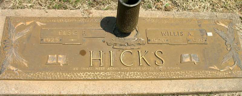 - [S8049] Find A Grave: Memorial Park Cemetery, Enid, Oklahoma, Willis A Hicks, created by David Schram, added Aug 2014 memorial number 133810435.