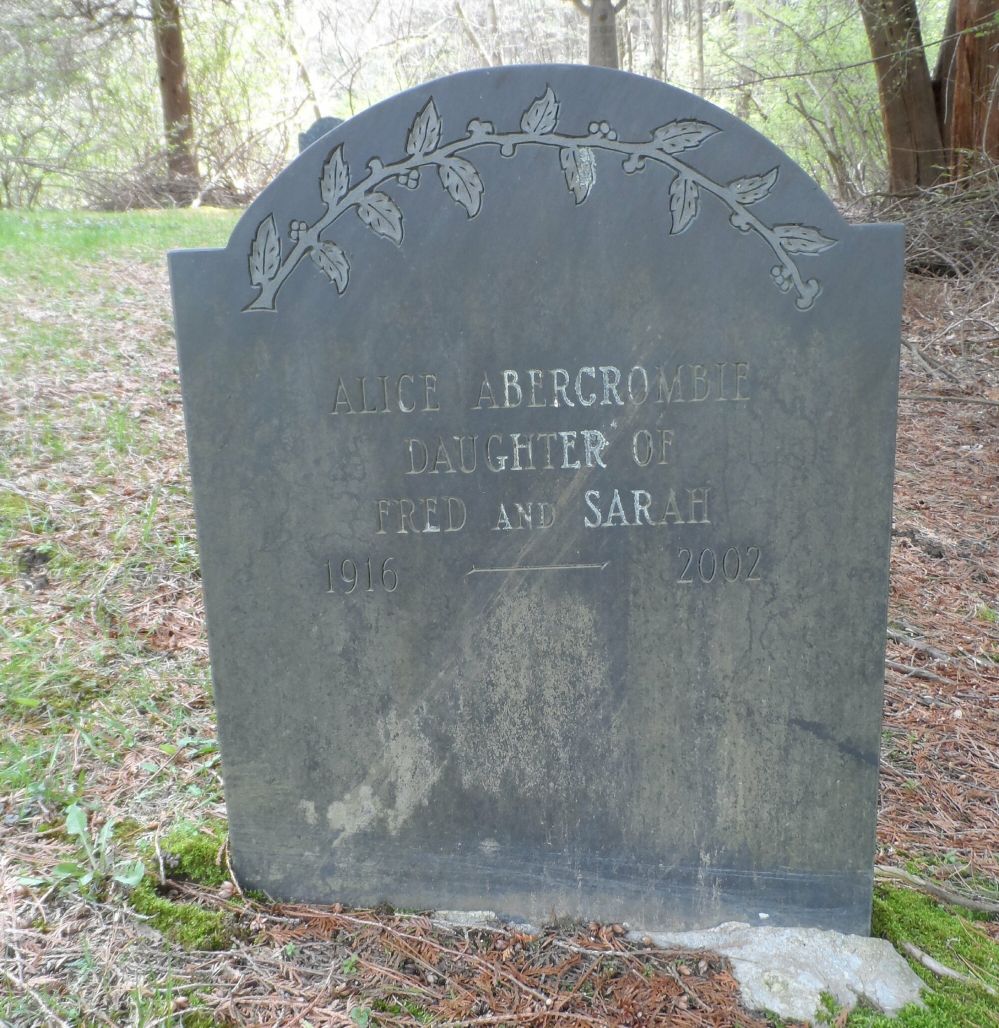 - [S7859] Find A Grave: Springdale Cemetery, Montague, Massachusetts, Alice Abercrombie, created by Searching Days Gone By, James Bianco, added May 2014, memorial number 129716008.