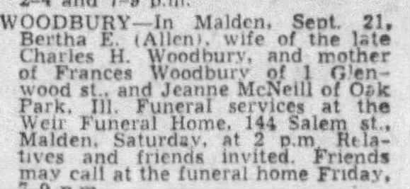 - [S6029] The Boston Globe, Boston, MA, Newspaper, Bertha E Allen Woodbury, obituary notice, pubished 23 sSep 1960, p 30.