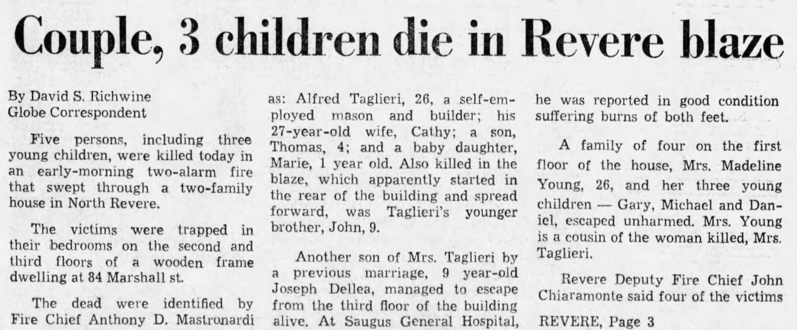 - [S6029] The Boston Globe, Boston, MA, Newspaper, Taglieri family, front page article, published 28 Jan 1975, the Boston Globe, p 1 & 3.