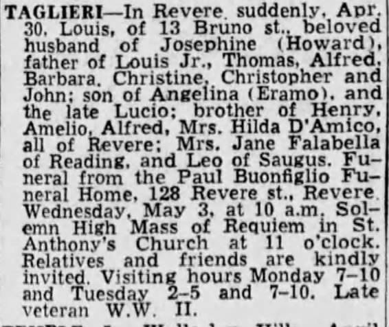 - [S6029] The Boston Globe, Boston, MA, Newspaper, Louis Taglieri, obituary notice, published 1 May 1967, p 36.