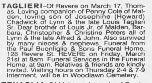 - [S6029] The Boston Globe, Boston, MA, Newspaper, Thomas Taglieri, obituary notice, published 20 Mar 1997, p 79.
