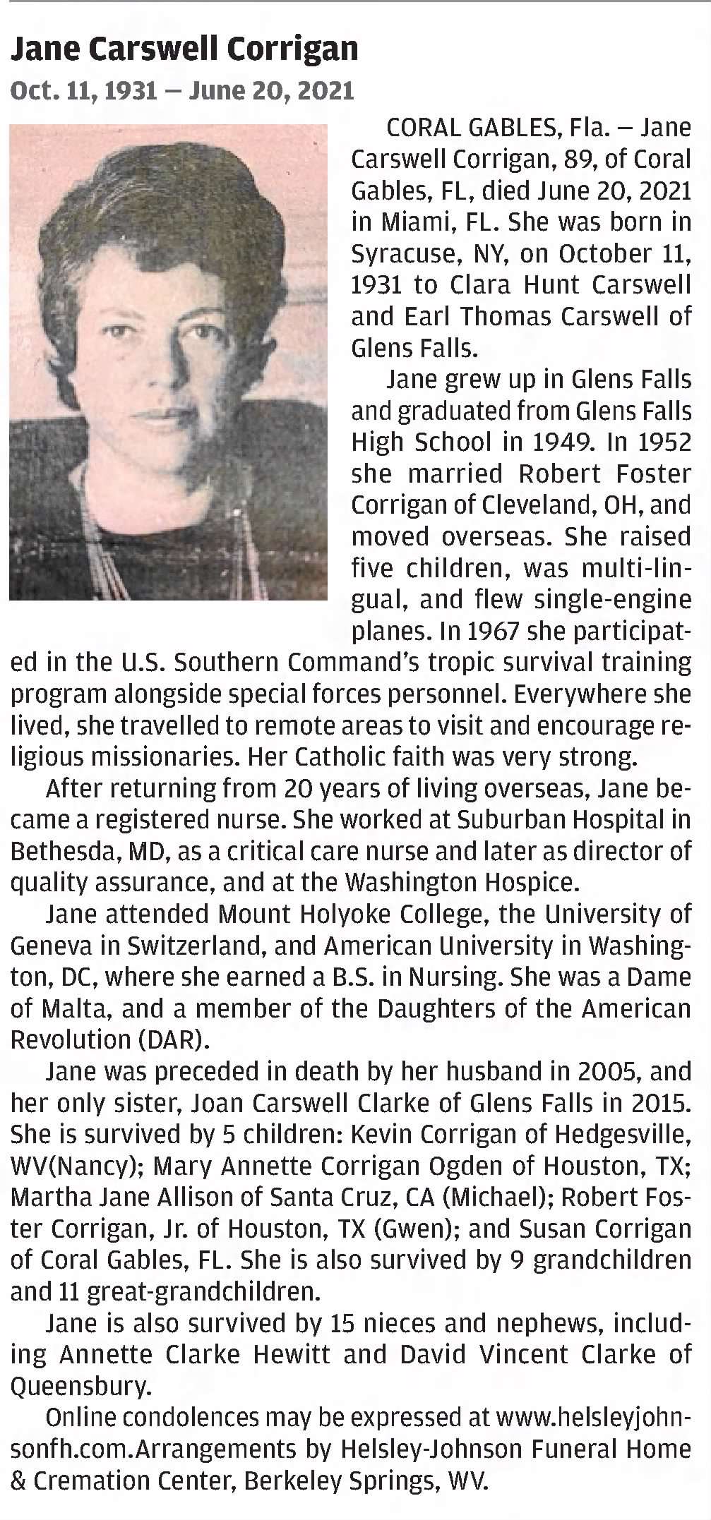- [S8210] The Post-Star, Glens Falls, New York, Newspaper, Jane Carswell Corrigan, obituary notice, published 25 Jun 2021.