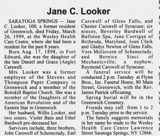 - [S4957] Find A Grave: Greenwich Cemetery, Greenwich, New York, Jane Carswell Looker, created by Alice, added Sep 2015, memorial number 153081286.