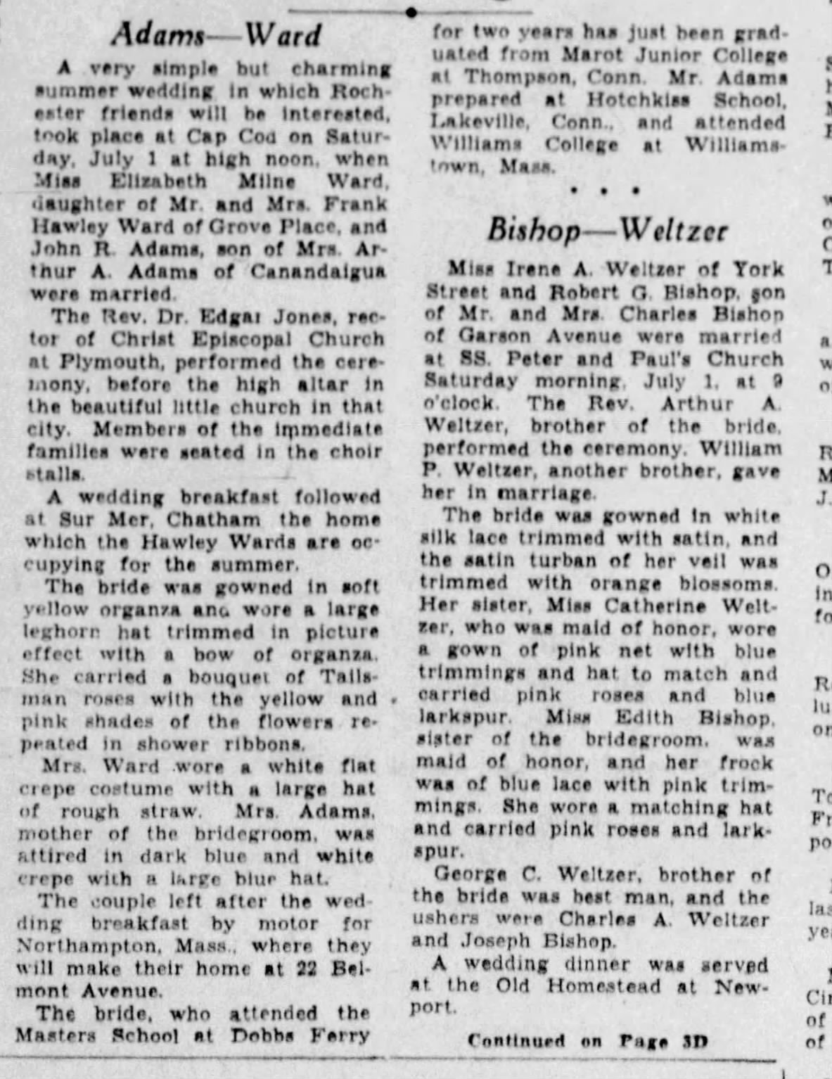 - [S7459] Democrat and Chronicle, Rochester, NY, Newspaper, Adams - Ward, marriage notice, published 9 Jul 1933 p 34.