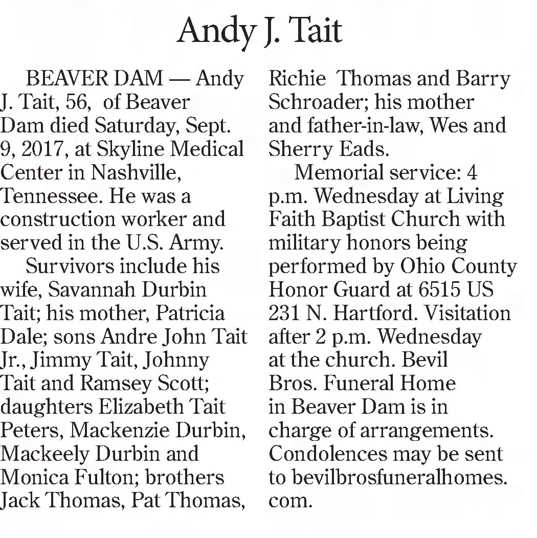 - [S9098] Messenger-Inquirer, Owenboro, KY, Newspaper, obituary notice for Andy J Tait, published 12 Sep 2017 page B3.