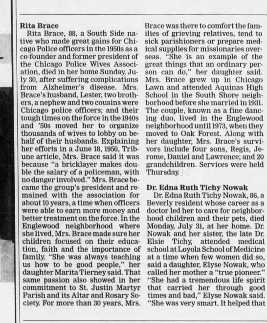 - [S7964] Chicago Tribune, Chicago, IL, Newspaper, Lester I Brace, obituary notice, published 6 Sep 1976, p 17.