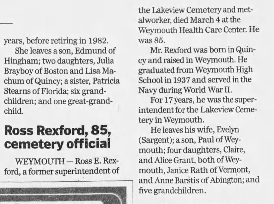 - [S6029] The Boston Globe, Boston, MA, Newspaper, Ross Rexford obituary notice, published 10 Mar 2005 p 124.
