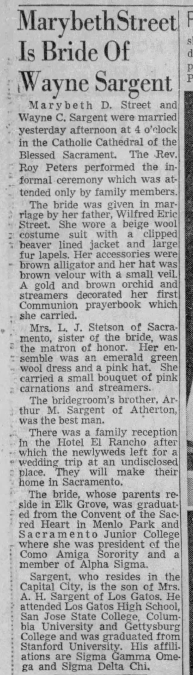 - Marybeth married Wayne Cummings Sargent, son of Arthur Harder Sargent and Myrtle Estelle Rohr, on 4 September 1955 in Sacramento, California.1,2