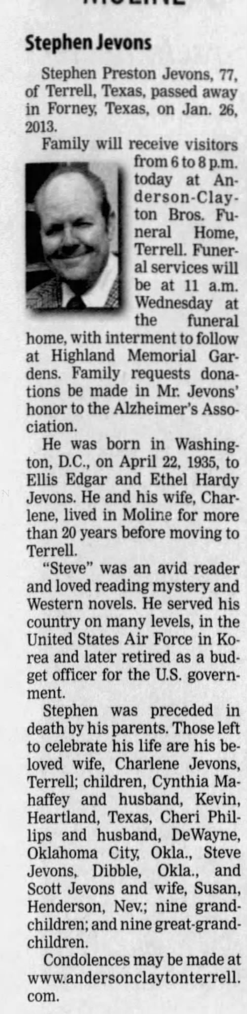 - [S8176] The Rock Island Argus, Moline, IL, Newspaper, Obituary notice Stephen Jevons, published 29 Jan 2013, p 5.
