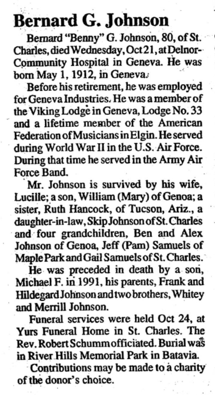 - [S2113] Find A Grave: River Hills Memorial Park, Batavia, Illinois, Bernard Johnson, created by chard, added Mar 2019, memorial number 197916084.