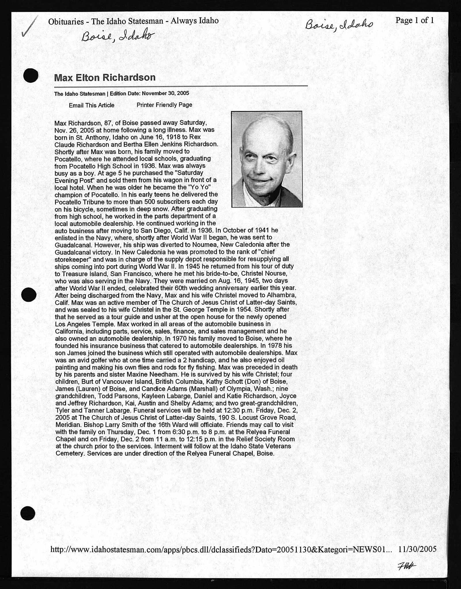 - [S2440] Find A Grave: Idaho State Veterans Cemetery, Boise, Idaho, Max Elton Richardson, created by R I P, Jean, addedMar 2006 memorial number 13782919.