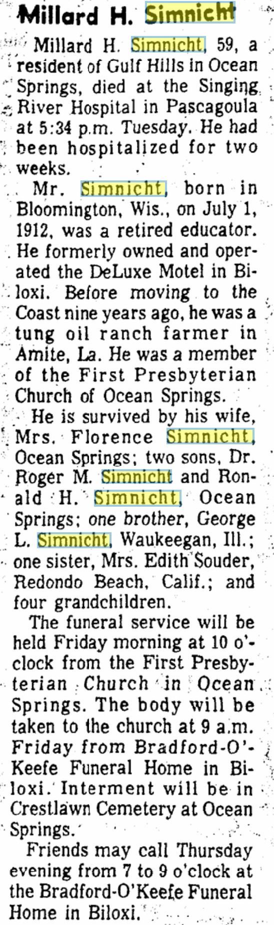 - Millard H Simnicht died on 11 April 1972 in Pascagoula, Mississippi, at age 59.1