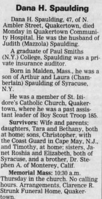 QUAKERTOWN, Pa. -- Judith A. Spaulding, 58, of Quakertown, died Wednesday, Feb. 1, 2006, at her home. She was the wife of the late Dana H. Spaulding.