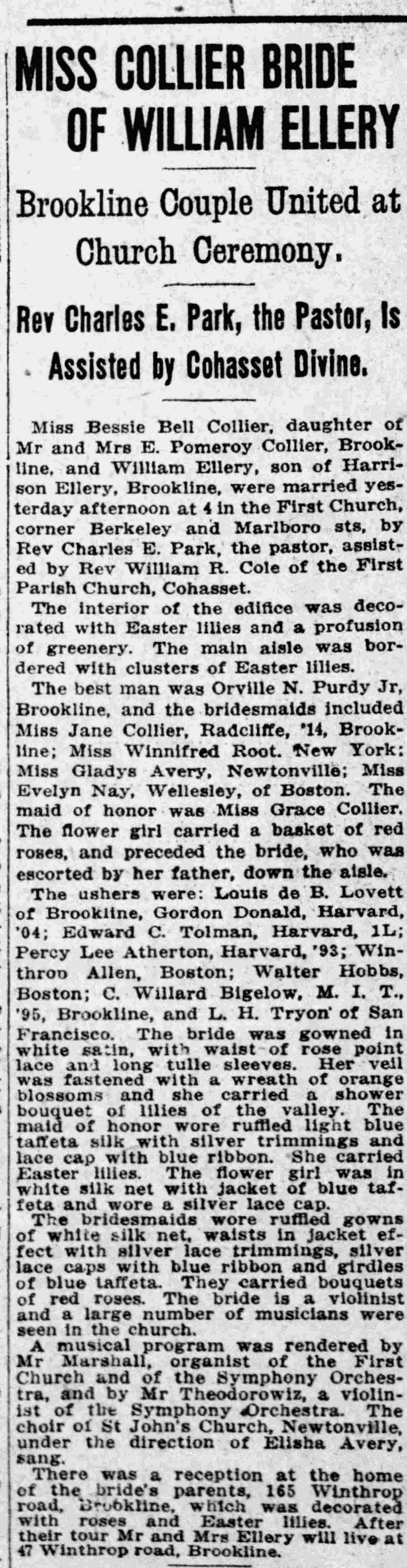 - [S333] Massachusetts: Vital Records 1911-1915, online image database, digitized by NEHGS, 2004, www.americanancestors.org. (Original publication: Massachusetts: Vital Records 1911-1915, New England Historic Genealogical Society,) original records from MA archives Marriage record, Ellery-Collier, vol 627, p 32.
