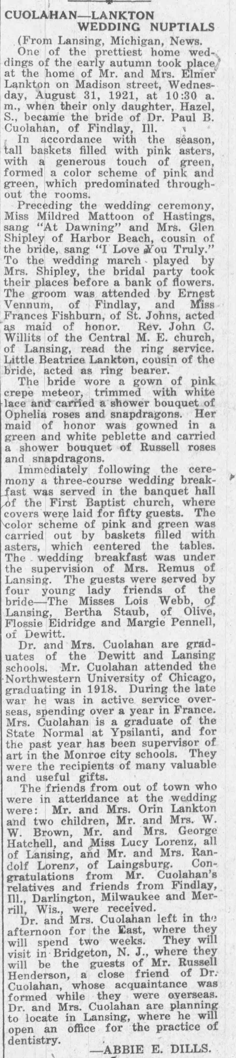 - [S9033] The Republican-Journal, Darlington, Wisconsin, Newspaper, Cuolahan-Lankton wedding, published 29 Sep 1921 p 1.