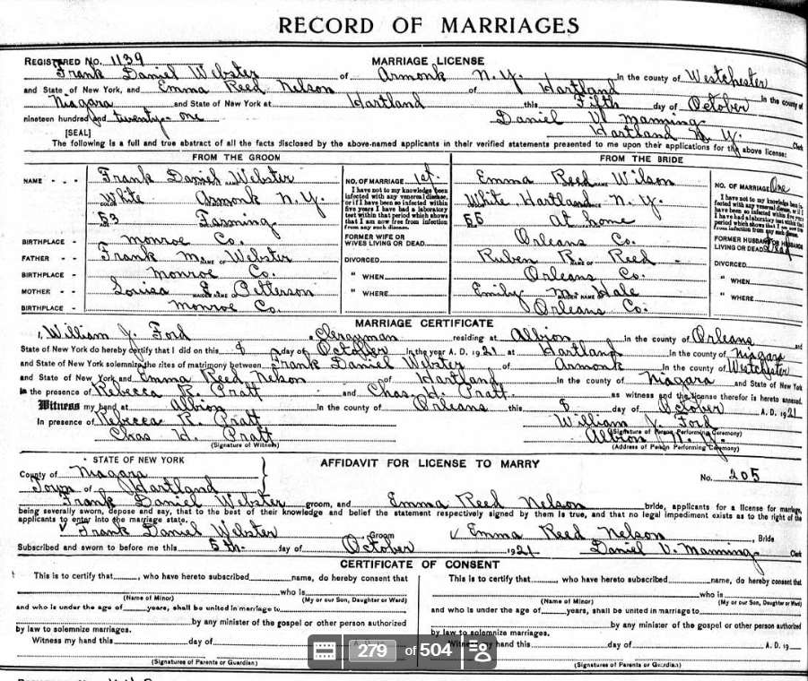 - Alma married Frank Daniel Webster, son of Frank Mather Webster and Lovisa E Peterson, on 6 November 1935 in Batavia, New York.1,3