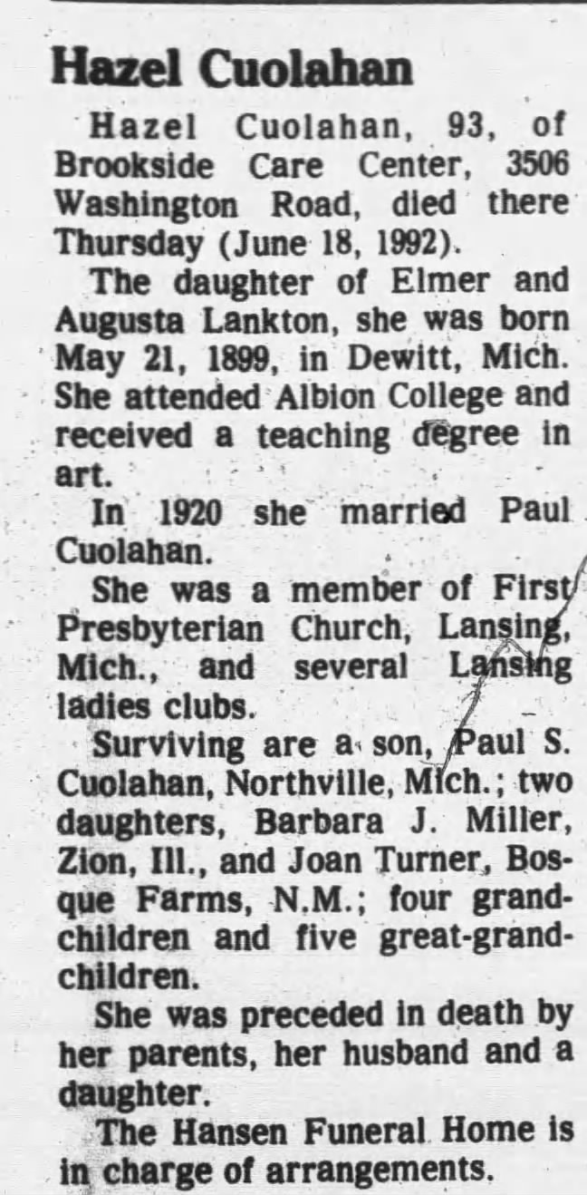 - [S9034] Kenosha News, Kenosha, Wisconsin, Newspaper, obituary notice Hazel Cuolahan, published 20 Jun 1992 p 8.