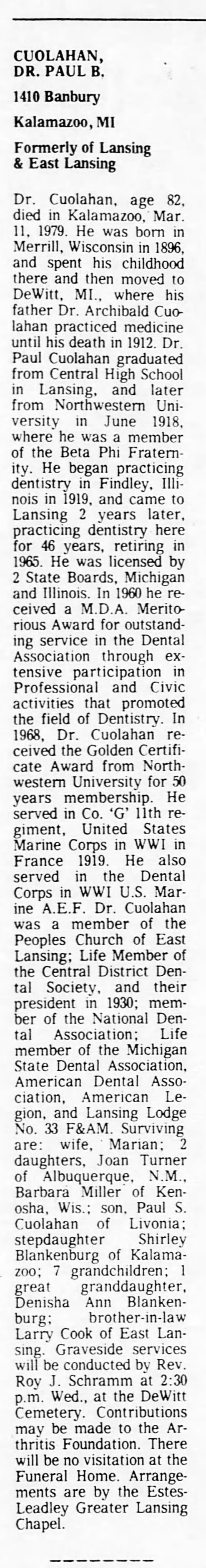 - [S7520] Lansing State Journal, Lansing MI, Newspaper, Dr Paul B Cuolahan obituary notice, published 12 Mar 1979, p 8.