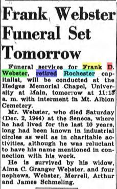 - Frank Daniel Webster and Alma appeared on the 1940 US Federal Census of Seneca Hotel; 26 South Clinton, Rochester, Monroe County, New York, enumerated on 1 April 1940.2