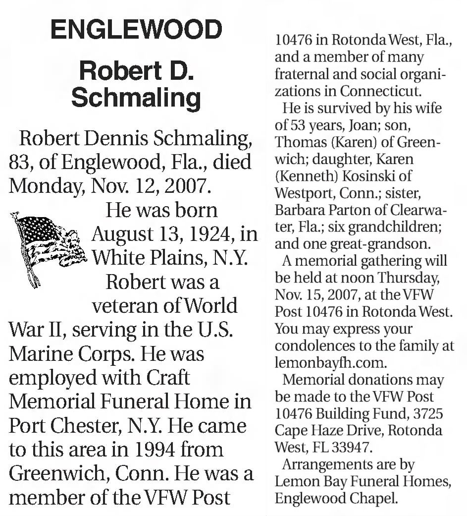 - [S9079] Port Charlotte Sun, Port Charlotte, FL, Newspaper, Robert D Schmaling obituary notice, published 14 Nov 2007 p 21.