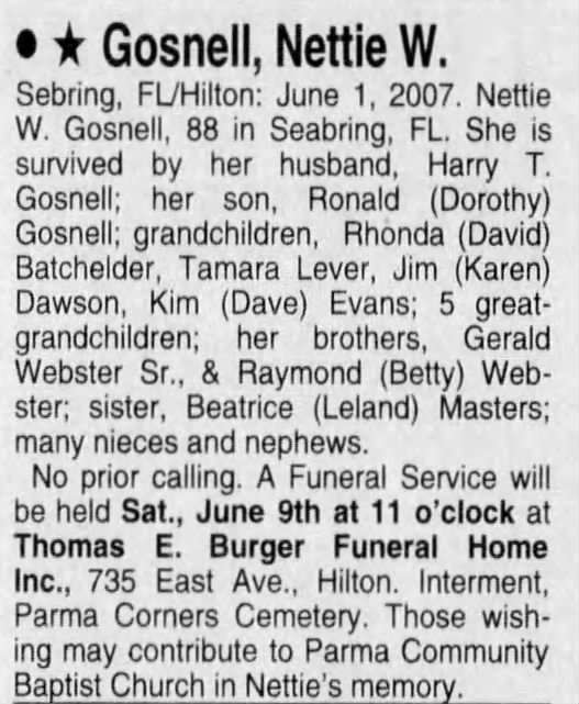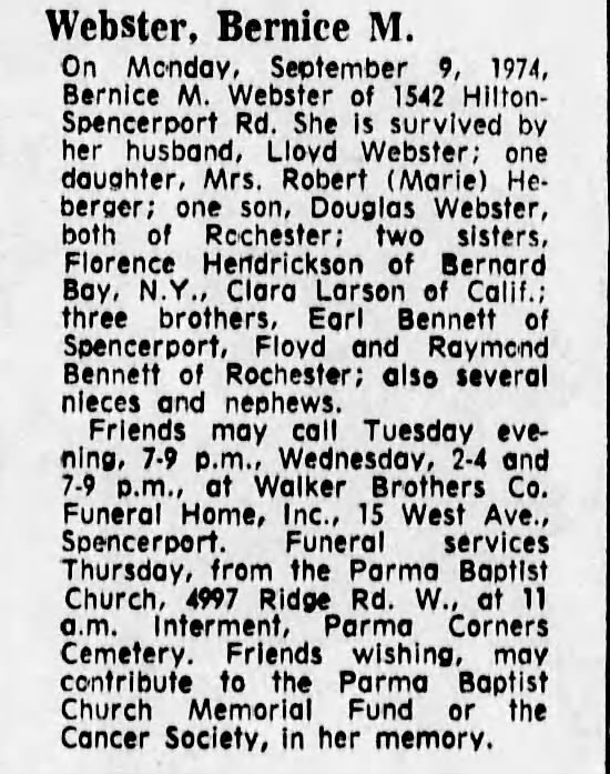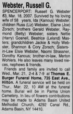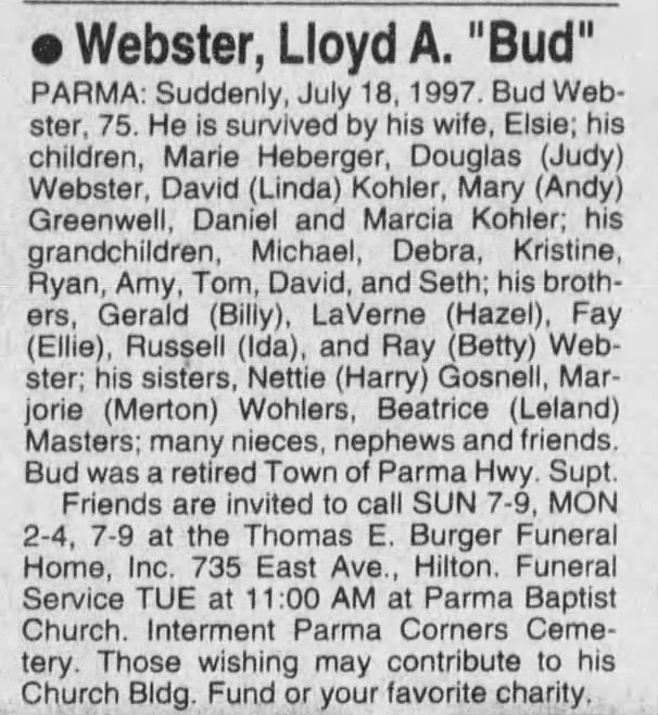 Masters, Beatrice E., 87, passed away Monday, January 11, 2016. She was the wife of the late Leland E. "Lee" Masters. Born in Parma, NY she was the daughter of the late Ernest and the late Elsie J. (Smith) Webster.
