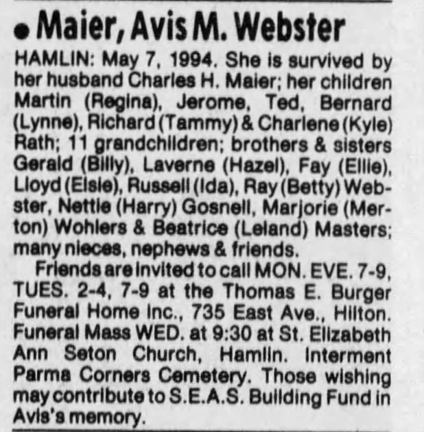 - [S7459] Democrat and Chronicle, Rochester, NY, Newspaper, obituary notice Avis M Webster Maier, published 9 may 1994, p 10.