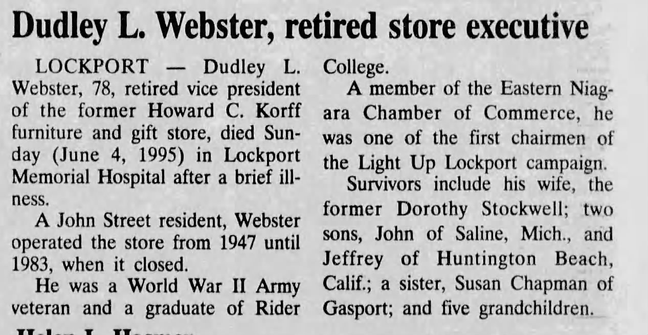 - [S9076] The Buffalo News, Buffalo NY, Newspaper, Dudley L Webster obituary notice, published 6 Jun 1995 p 13.