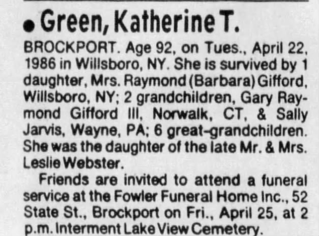 - [S7459] Democrat and Chronicle, Rochester, NY, Newspaper, Katherine T Green obituary notice, published 24 Apr 1986, p 16.