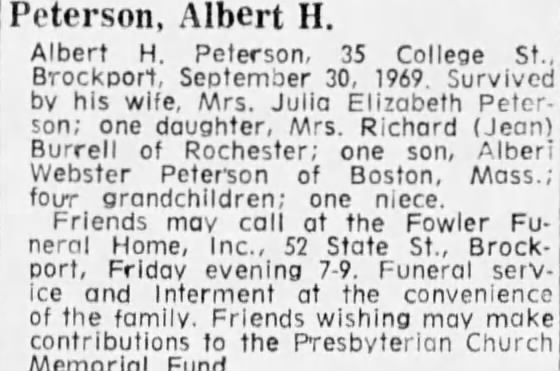 - [S7459] Democrat and Chronicle, Rochester, NY, Newspaper, Albert H Peterson obituary notice, published 2 Oct 1969, p 27.
