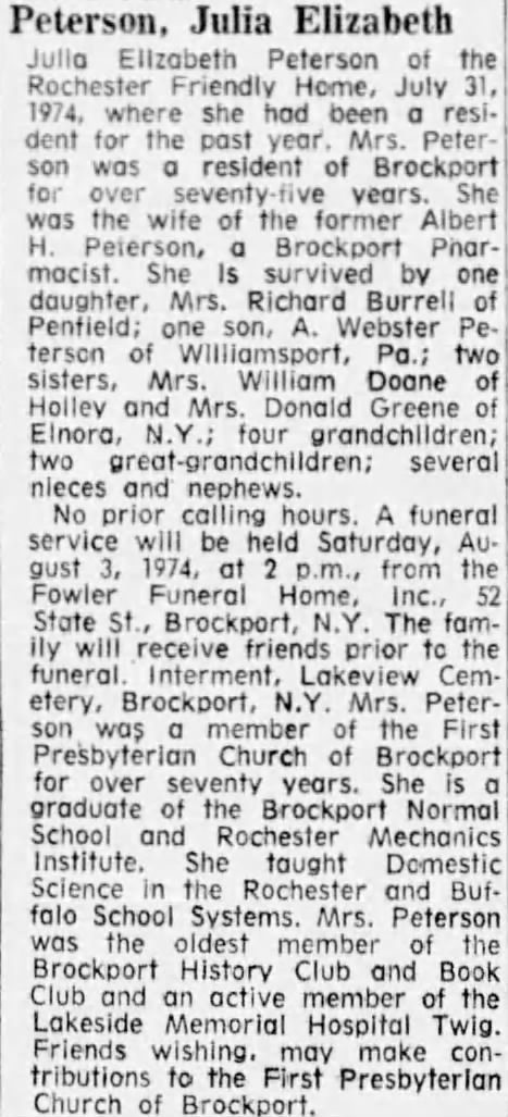 - [S7459] Democrat and Chronicle, Rochester, NY, Newspaper, Julia Elizabeth Peterson obituary notice, published 2 Aug 1974, p 24.