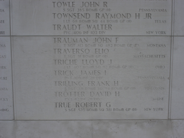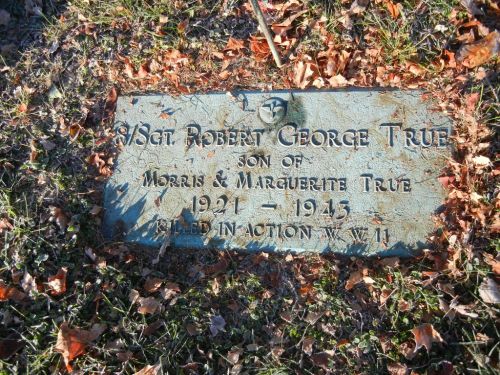 SSG Robert G. True's body was never recovered. His name is inscribed with other missing airmen on a wall in the American Cemetery and Memorial in Margraten, Limburg Provence, Netherlands. The other members of his crew that are also memorialized in Margraten are; Johnston, East, Richard, Greer and Woddyatt.