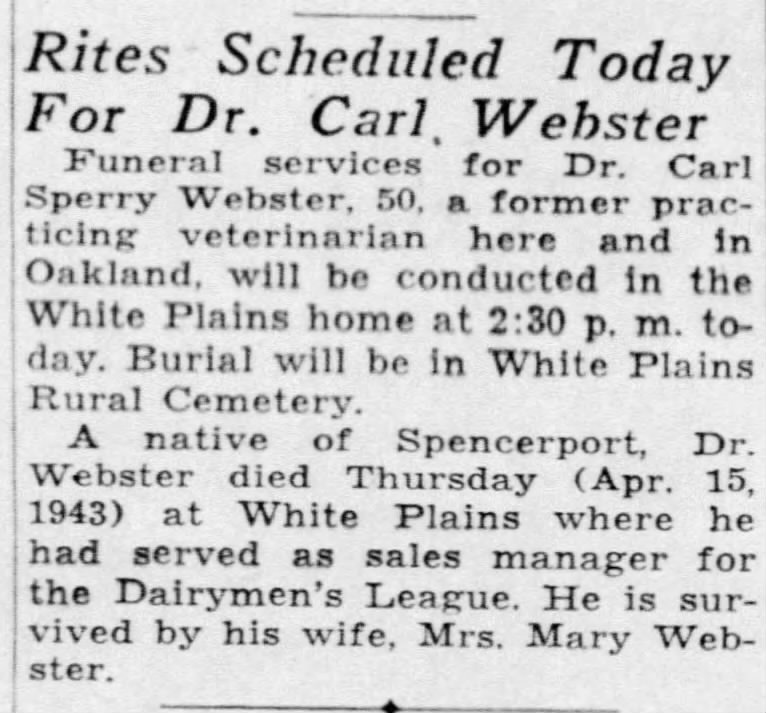 - [S7459] Democrat and Chronicle, Rochester, NY, Newspaper, Dr Carl Webster obituary notice, published 18 Apr 1943 p 26.