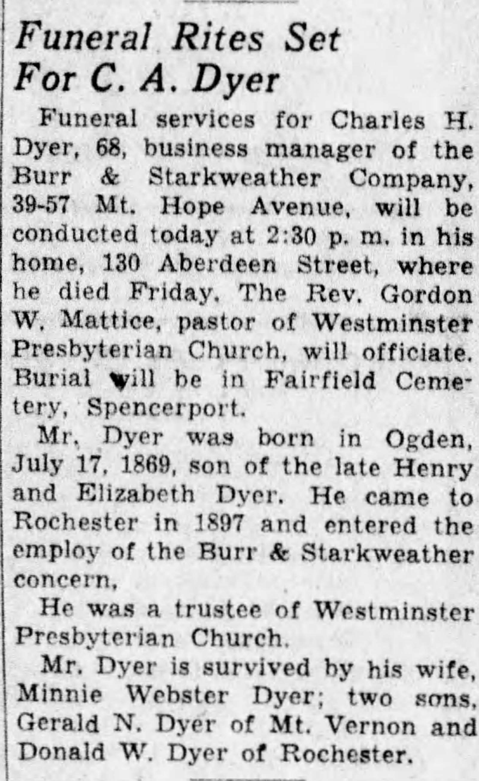 Friends are invited to call at Smith and Lotze Funeral Chapel, 10 Lapham Park, Webster fro 2-4 and 7-9 where services will be held Saturday at 2 p.m., Rev. Charles Griffith officiating. Interment, Webster Rural Cemetery.6