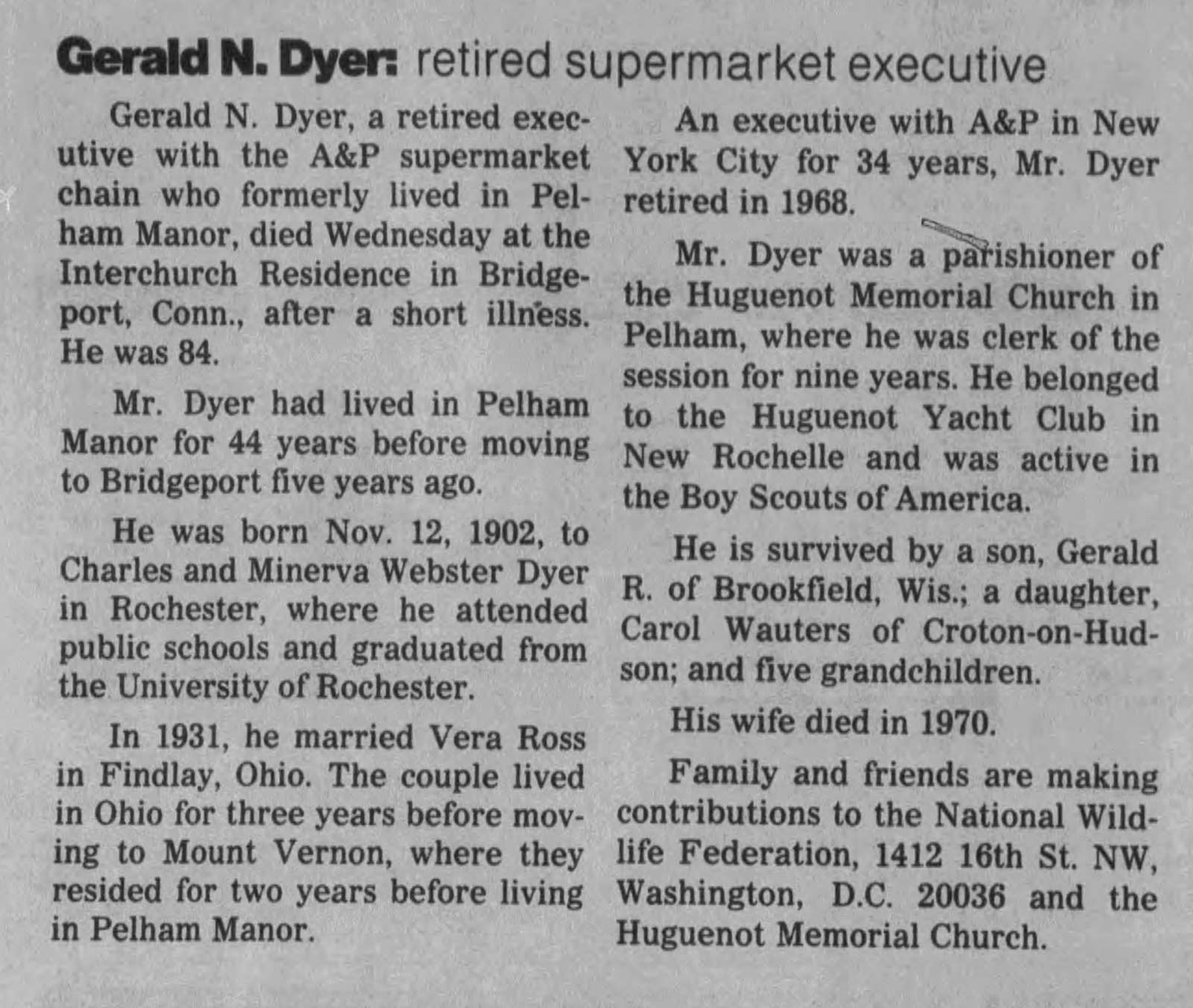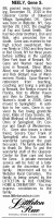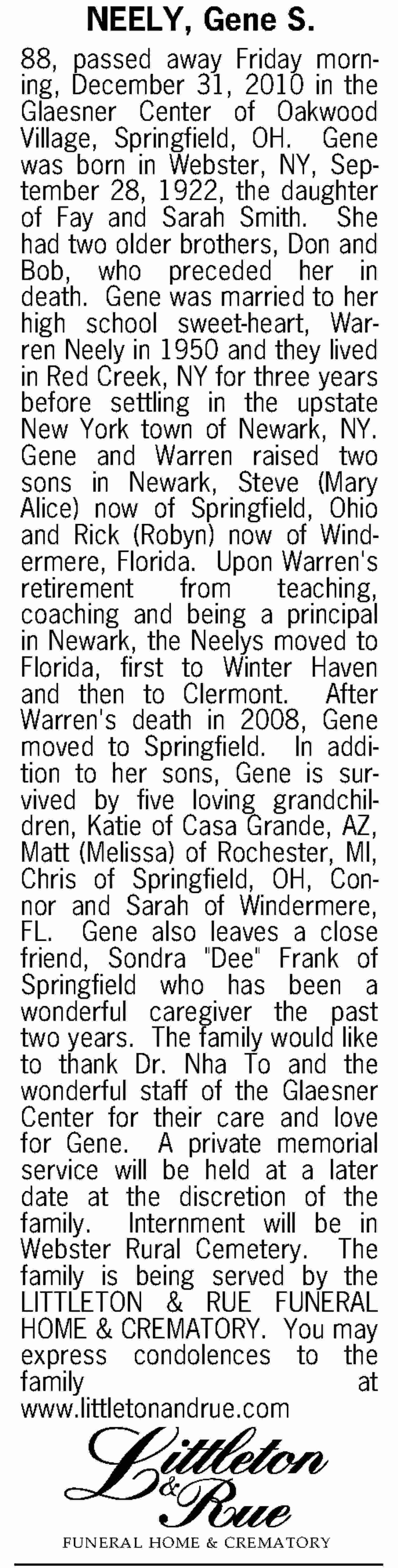 Sara Smith, in Indiana, Pa., formerly of Webster, N.Y., March 28, 1972. She is survived by two sons, Donald of Indiana, Pa., Robert of Tonowanda, N.Y.; one daughter, Mrs. Warren (Gene) Neely of Newark, N.Y.; ten grandchildren.