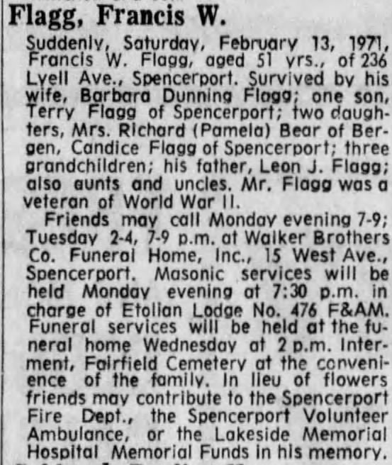 - [S7459] Democrat and Chronicle, Rochester, NY, Newspaper, Francis W Flagg obituary notice, published 16 Feb 1971 p 18.