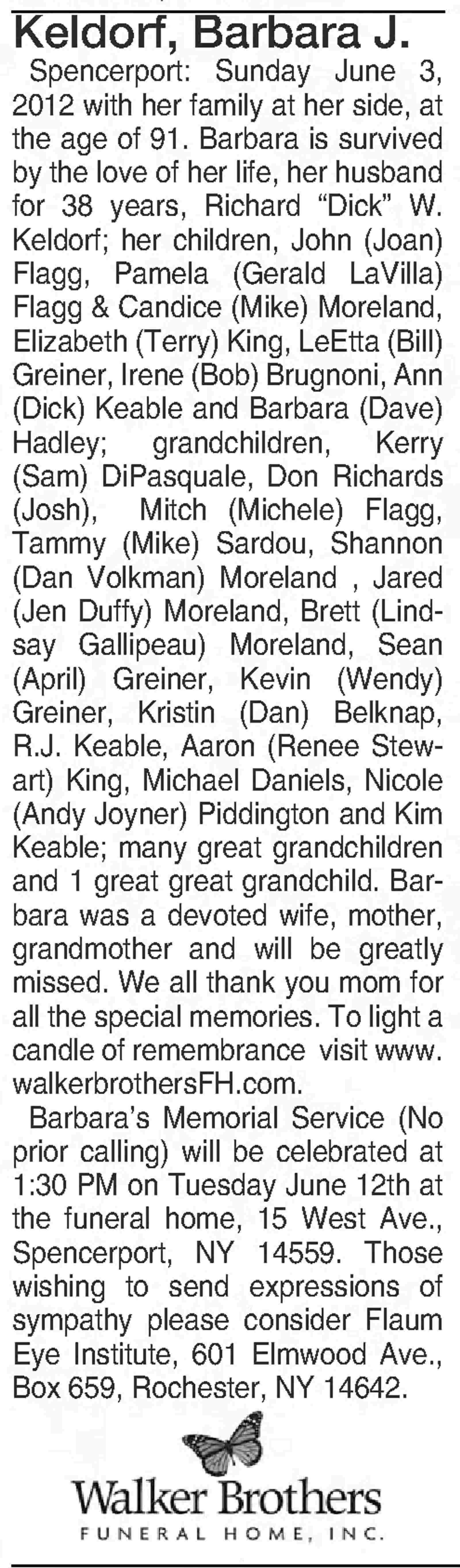- [S7459] Democrat and Chronicle, Rochester, NY, Newspaper, Barbara J Keldorf obituary notice, published 10 Jun 2012, page B4.