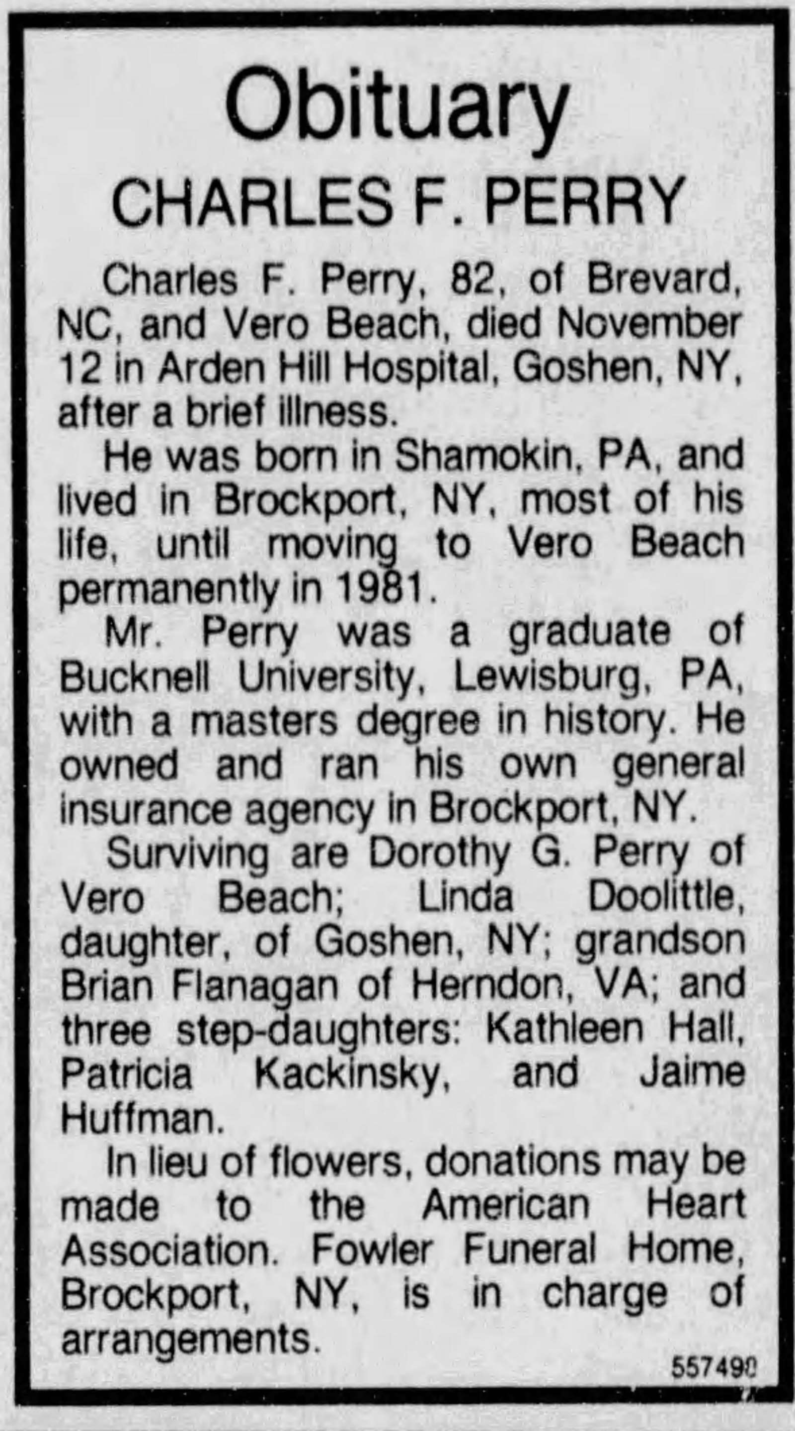 - [S9152] Press Journal, Vero Beach FL, Newspaper, Charles F Perry obituary notice, published 18 Nov 1995 p 4.