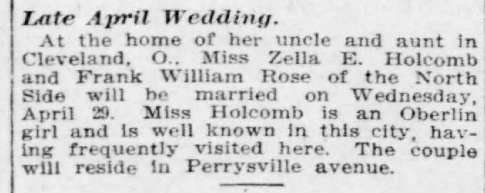 - Zella married Frank William Rose on 29 April 1914 in Cleveland, Ohio, The notice was in the Pittsburgh Post-Gazette.2,3