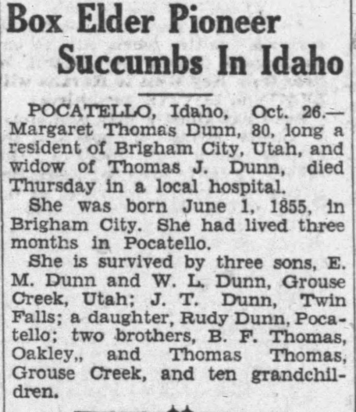 - [S2390] Ogden Standard Examiner, Ogden, Utah, Newspaper, Margaret Thomas Dunn obituary notice, published 26 Oct 1935 p 2.