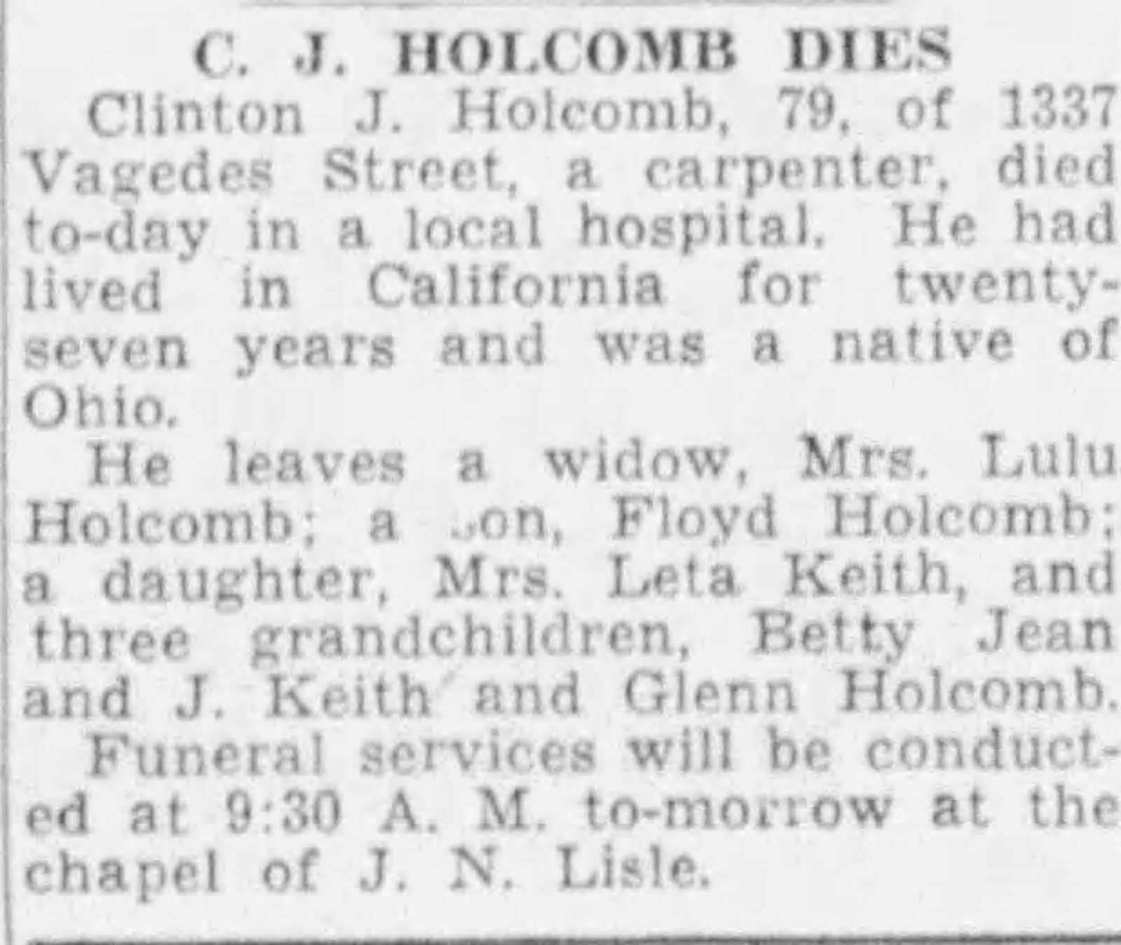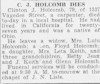 - [S9175] The Fresno Bee, Fresno CA, Newspaper, C J Holcomb obituary notice, published 12 Mar 1935 p 13.