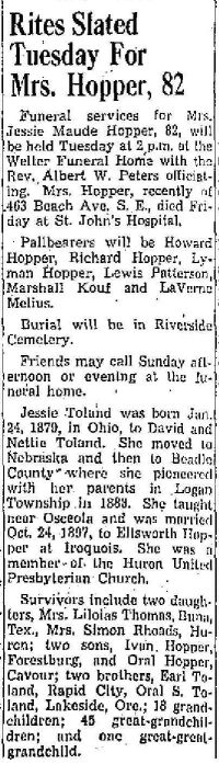 - [S9182] Find A Grave: Riverside Cemetery, Huron, South Dakota, Jessie Maude toland Hopper, created by DiAnn, added Feb 2011, memorial number 65518477.