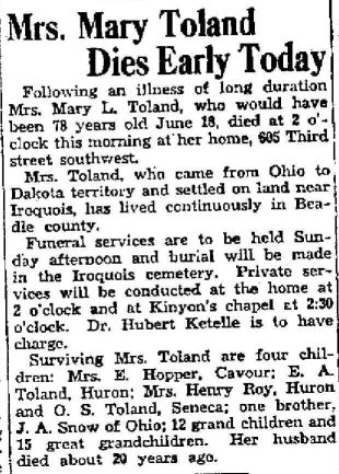 - [S9181] Find A Grave: Maplewood Cemetery, Iroquois, South Dakota, Mary L Snow Toland, created by DiAnn, added Feb 2011, memorial number 65523061.