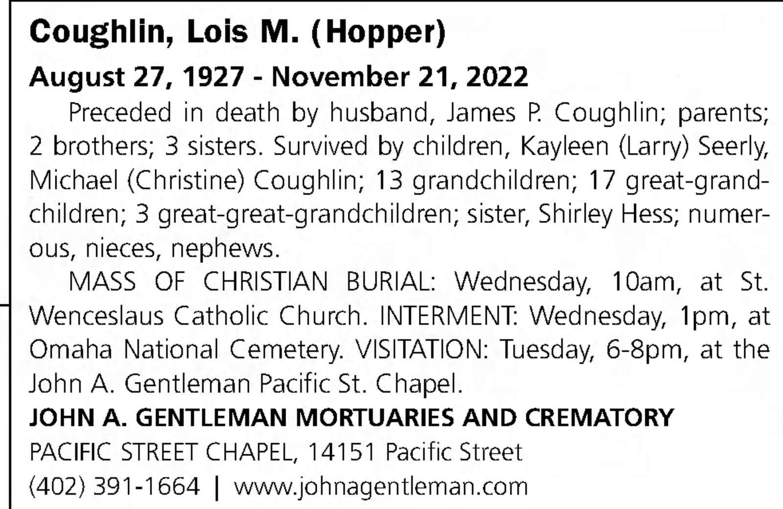 She is survived by her daughter, Deborah Bubrick; son, Donald E. (Bonnie) Hopper; four grandchildren, Jennifer (Erik Atkinson) Bubrick, Erin Bubrick, Kevin (Stephanie) Hopper and Kelly Hopper; nine great-grandchildren, Brody Hopper, Marlee Hopper, Beckett Hopper, Kendall Hopper, Margaret Atkinson, Jense Atkinson, Hazel Atkinson, Celia Atkinson, and Mabel Bubrick.