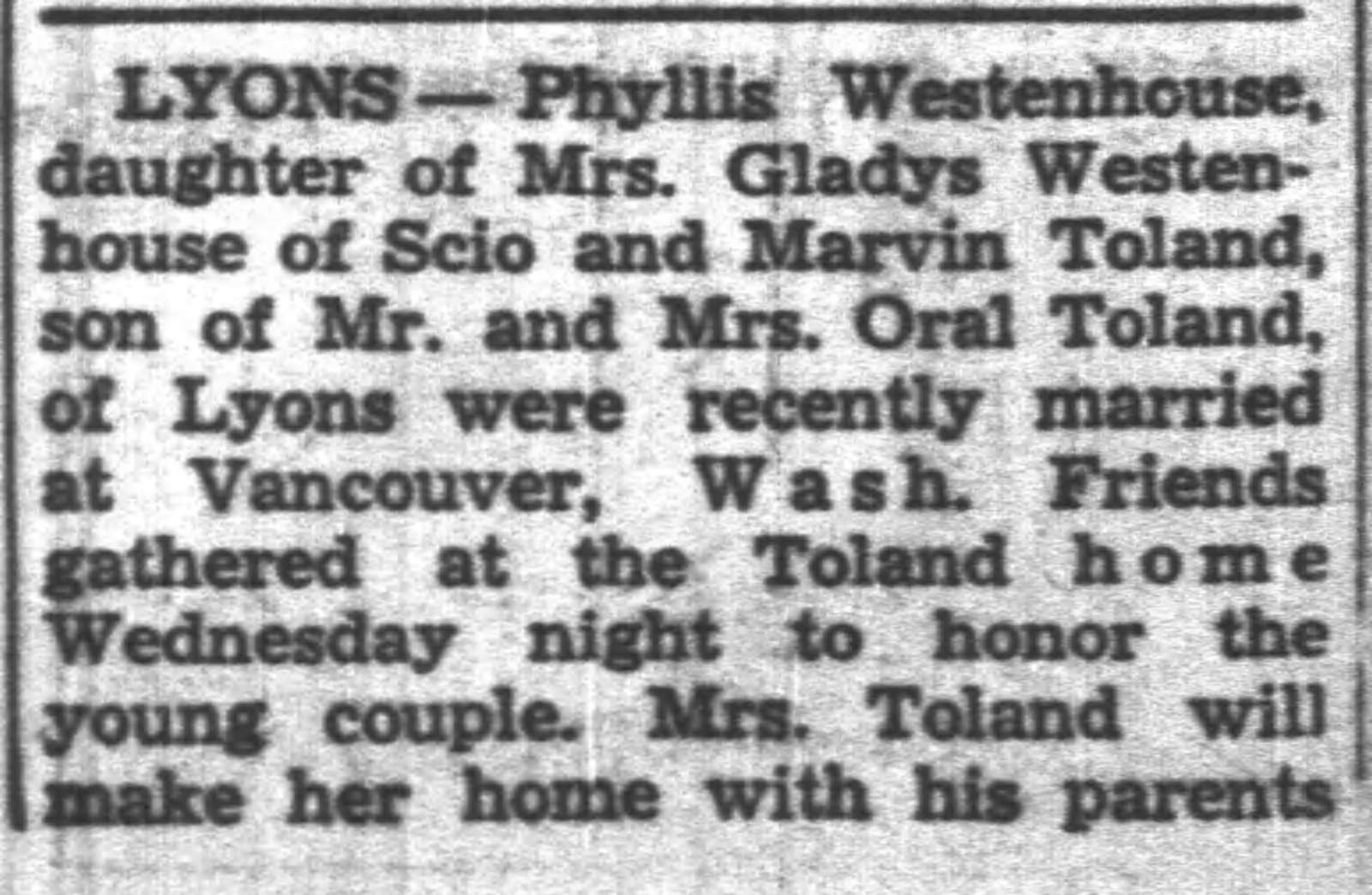 - [S8626] Statesman Journal, Salem, OR, Newspaper, Marriage Toland -Westenhouse, published 11 Mar 1941 p 12.