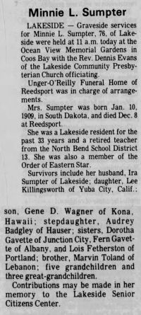 - [S9210] The World, Coos Bay OR, Newspaper, obituary notice Minnie L Sumpter, published 11 Dec 1985 p 3.