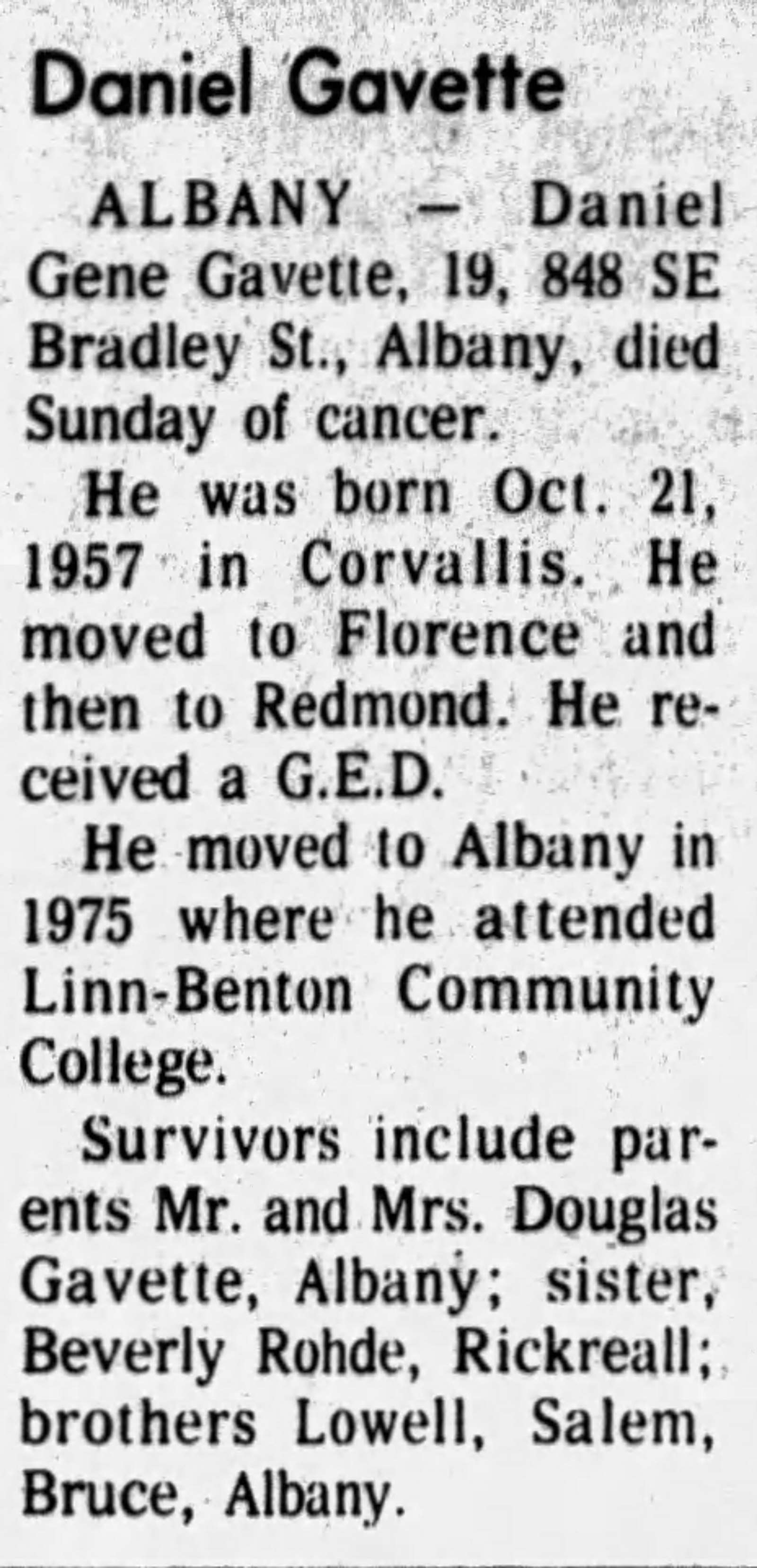 Arrangements by Andreason's Cremation & Burial Service in Springfield. Remembrances to local hospice and cancer treatment.1