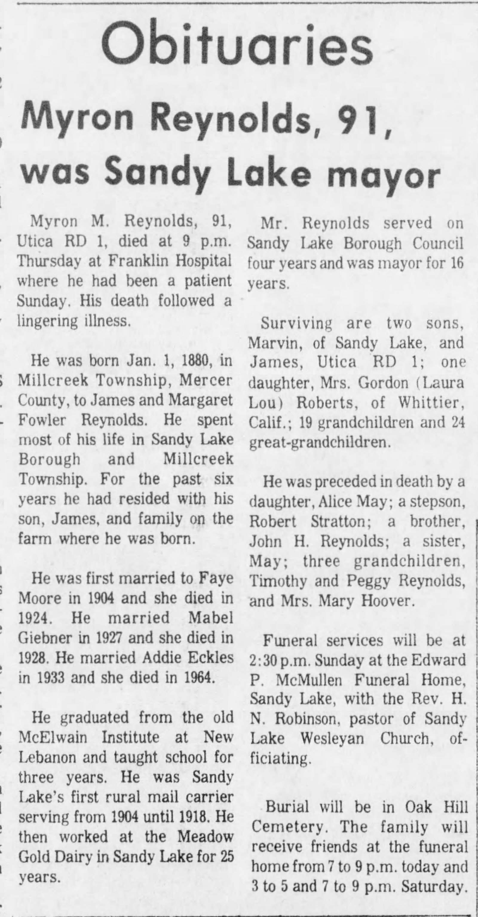 Calling hours will be from 4 to 7 p.m. Sunday in the Scott A. Black Funeral Home, 99 Franklin St., Stoneboro. Funeral services will be held at 11 a.m. Monday in Sandy Lake Presbyterian Church, 3461 Sandy Lake-New Lebanon Road, Sandy Lake, with the Rev. Adam J. Rodgers, pastor, officiating. Interment will be in Oak Hill Cemetery, Sandy Lake, Sandy Lake Township.