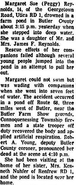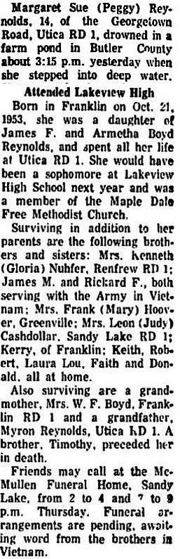 - [S9234] Find A Grave: Oak Hill Cemetery, Sandy Lake, Pennsylvania, Margaret Sue Reynolds, created by Pauline Harnett, added Jul 2015, memorial number 149825470-newspaper.
